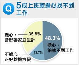 勞委會於本月16日公布,放無薪假共有48家廠商、5,021名勞工。根據yes123求職網網路線上調查顯示,有五成(49.3%)的上班族擔心自己被公司裁員,另有一成(13%)上班族表示,已經被企業裁員。