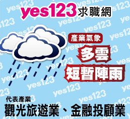 ●多雲短暫陣雨:觀光旅遊業、金融投顧業。此兩產業容易受到景氣波動影響,景氣低迷,出門旅遊的人數減少,衝擊觀光。而股市不好,金融投顧業首當其衝,人人羨慕的金飯碗頓時也可能成為破飯碗。