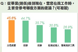 根據yes123求職網的調查發現,在未滿40歲的上班族當中,有高達七成六(75.7%)的人表示,剛畢業(退伍)進入職場時,並「不清楚知道」要從事哪一類型的工作!另外,每當要求職時,會參考哪些方面的建議呢?此次調查也顯示,主要靠下列這五種來源:「父母長輩」(45.6%)、「同學」(44.7%)、「同事」(35.7%),以及「配偶或情人」(30.8%)、「專業測評工具」(26.9%)!不過有趣的是,仍有一成六(16%)的求職者透露,在找工作時,也會參考一下「命理」!(例如:算命、星座、塔羅牌)