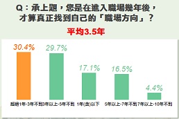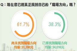 只是截至目前為止,有沒有求職方向感呢?由yes123求職網的調查來看,僅有38.3%的人自認,「已經真正找到職場方向」,而且平均花了3.5年才找到,等於耗費再唸一次大學的時間!意味著其餘61.7%的上班族,仍處於職場迷航中:「尚未真正找到職場方向」!進一步以「薪資」進行交叉分析,結果更顯示:「已找到職場方向」的,平均月薪為34,016元;「尚未找到職場方向」的,平均月薪為31,398元。前者是後者的1.08倍!(薪資水準高出8%)